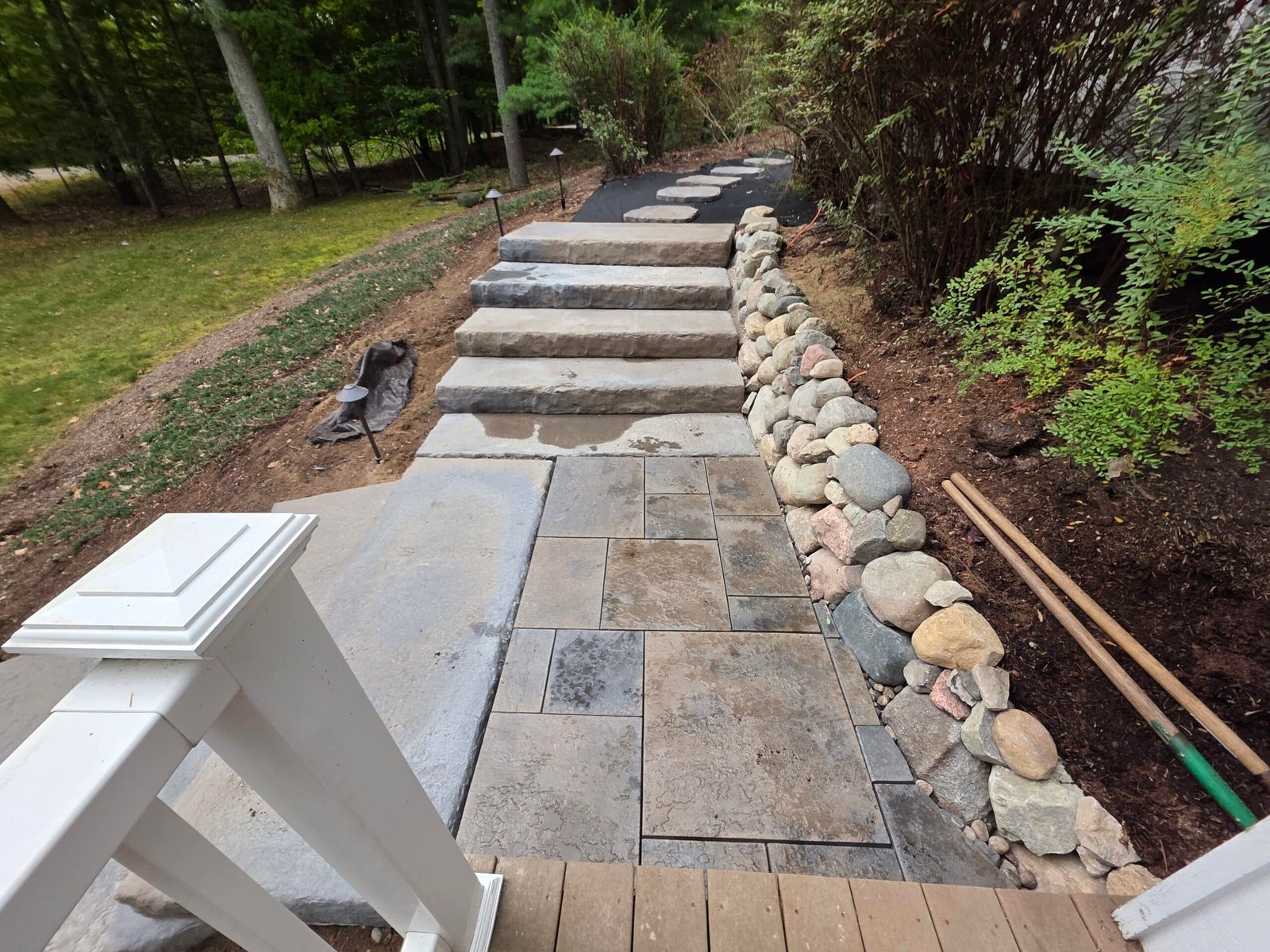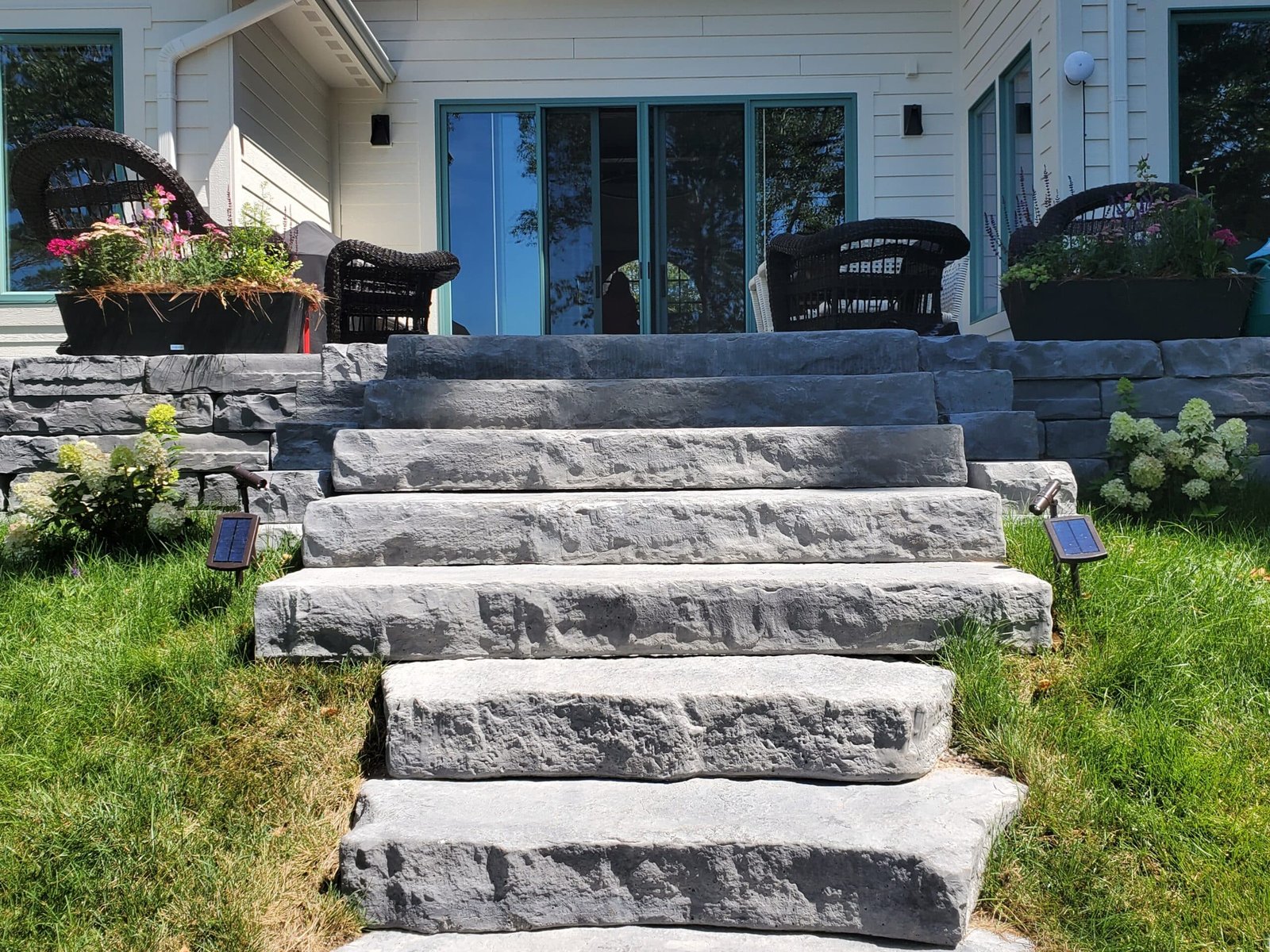 Engineered stone stairs are long lasting, easy to maintain and extremely functional. Dimensional and irregular options are available to suit your style and needs. Different sizes, step heights, colors and textures are available to suit or match any hardscape.